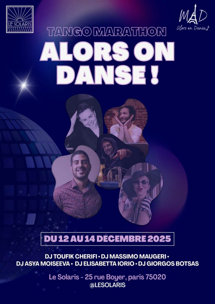 La grande salle du Solaris se transforme en temple du tango pour un Tango Marathon du 12 au 14 décembre 2025. Trois jours de danse, de musique et de passion au Solaris. Du 12 au 14 décembre 2025.